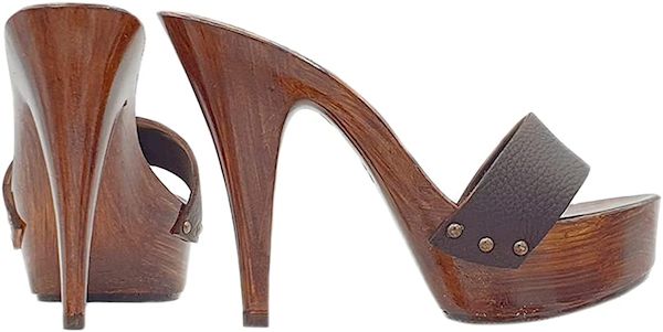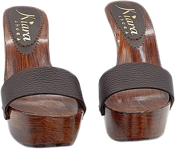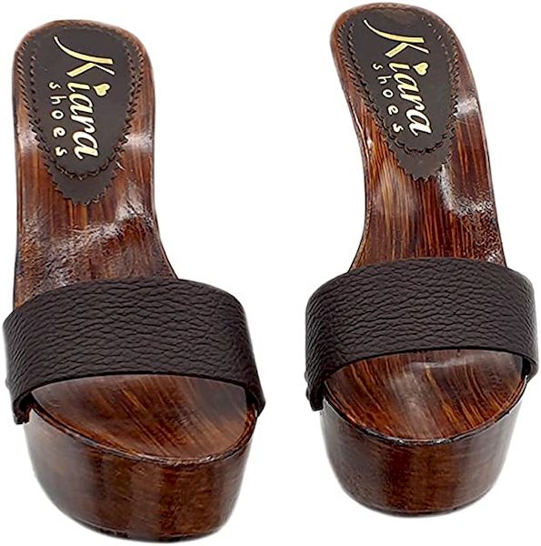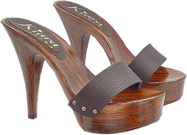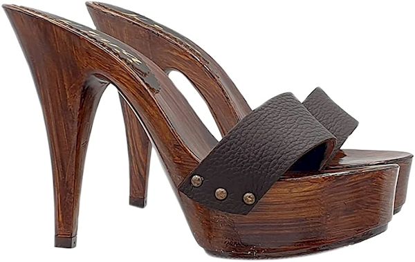 Zoccolo con base effetto legno lucido con tacco alto 13 cm e plateau alto 4 cm
