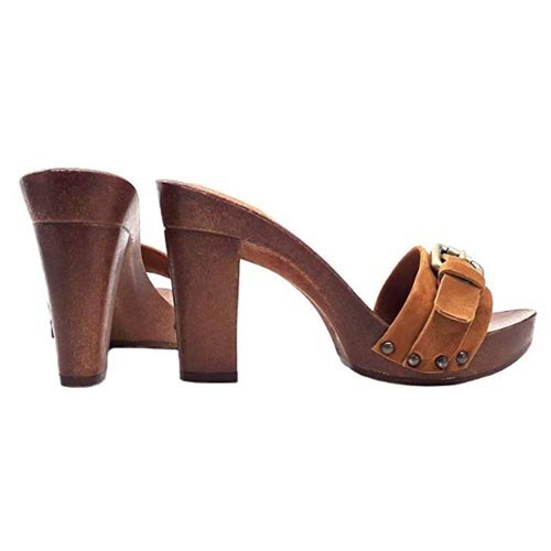 Zoccoli con base effetto legno e tacco 10 di media larghezza, plateau da 2 cm