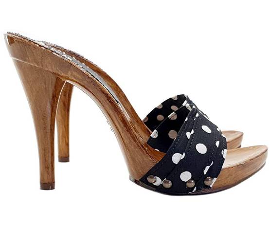Zoccoli con doppia fascia nera in tessuto con pois e tacco da 12cm. Zoccoli estate 2020