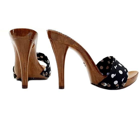 Zoccolo con base effetto legno laccato e tacco a spillo alto 12 cm.